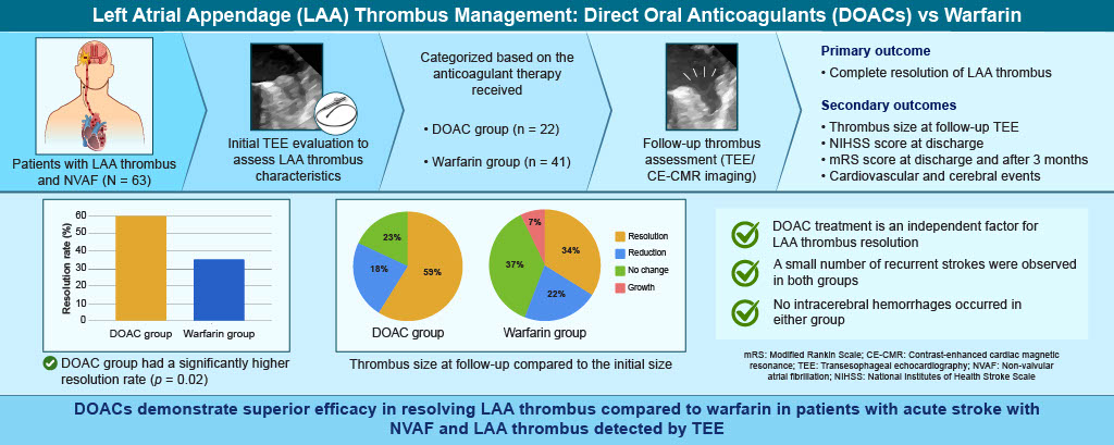 心原性脳塞栓症で入院した患者で、左心耳に血栓が残存していたとき、通常のDOAC治療で血栓は溶けるのか?多施設後ろ向きで検証しました。