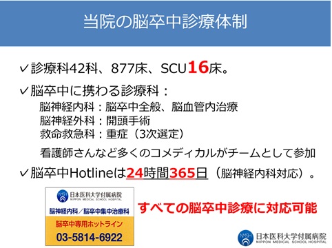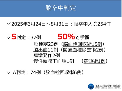 救急隊が脳卒中疑いの患者さんを病院に搬送する際、発症時間や症状で搬送先を選定します。これまであった脳卒中A・B判定に加えて、東京都では今年の3月から、機械的血栓回収療法が必要そうな場合は脳卒中S選定として限られた病院に運ぶことになり、当院でも受け入れが始まりました。